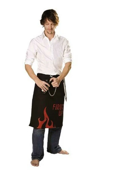 Grillschürze mit aufgesetzter Tasche z.B. für eine 0,33-l-Flasche, stabilem Kapselheber an einer Kette sowie zwei Schlaufen zum Einhängen von Grillwerkzeug.